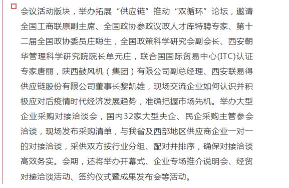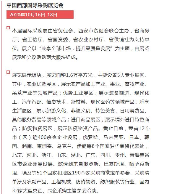 中國(guó)西部國(guó)際采購(gòu)展覽會(huì)(以下簡(jiǎn)稱(chēng)“國(guó)際采購(gòu)展”),于2020年10月16日-18日在西安國(guó)際會(huì)展中心展覽館1號(hào)展廳舉行。本屆國(guó)際采購(gòu)展以“共享全球市場(chǎng),提升高質(zhì)量發(fā)展”為主題,深度融入共建“一帶一路”,助力陜西打造內(nèi)陸改革開(kāi)放高地,落實(shí)好穩(wěn)外資、穩(wěn)外貿(mào)的要求,更好服務(wù)疫情常態(tài)化形勢(shì)下企業(yè)開(kāi)拓國(guó)際市場(chǎng)。我公司受西安貿(mào)促會(huì)邀請(qǐng)參加本次展覽會(huì)。